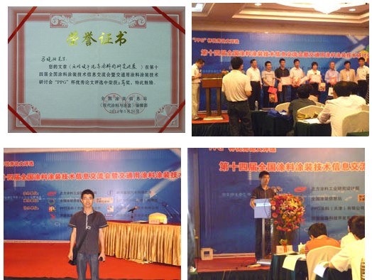 2011年5月25-26日在西安皇后大酒店舉辦的“PPG杯”第十四屆全國涂料涂裝技術(shù)信息交流會暨交通用涂料涂裝技術(shù)研討會上,由我公司馬曉陽博士主講的“水性快干汽車涂料的研究進展”榮獲專業(yè)論文三等獎。